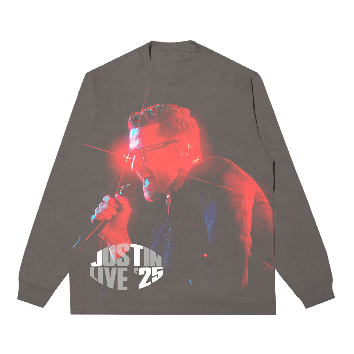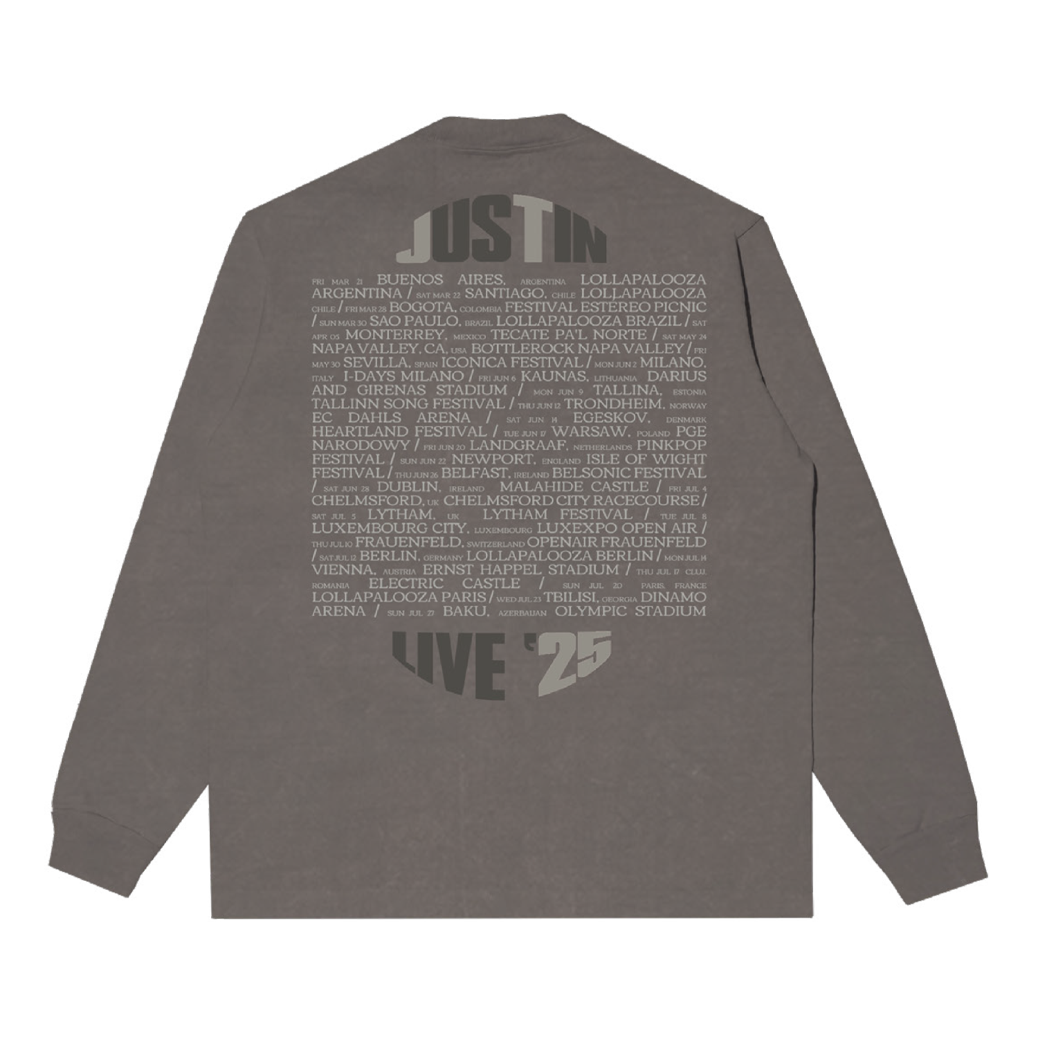 A grey unisex longsleeve with Justin Live 2025 Tour photo design printed on the front and tour dates printed on the back.